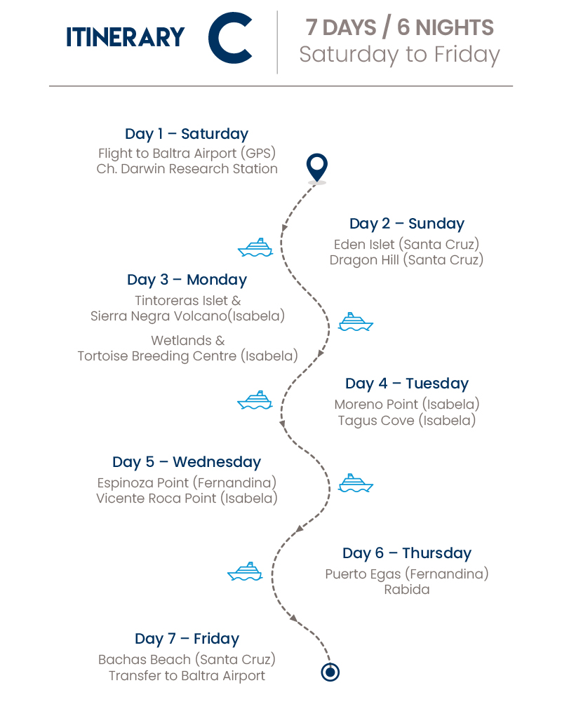Our 6 night-route runs around the largest, seahorse-shaped island of Isabela, where nature seems to hunt for the greatest. Explore the virtually untouched western end of the Galapagos Islands, which has just been born out of fire. You are right on time for the first thrilling chapters of evolution! Uncover the mystery of how tough pioneer species make barren lava fields habitable; and approach bizarre outgrowths of adaptation as marine iguanas and flightless cormorants. It’s true that accessing this remote and isolated region demands longer navigation (mainly overnight), but our stable mega-catamaran enables you to witness ‘survival of the fittest’, without experiencing it.